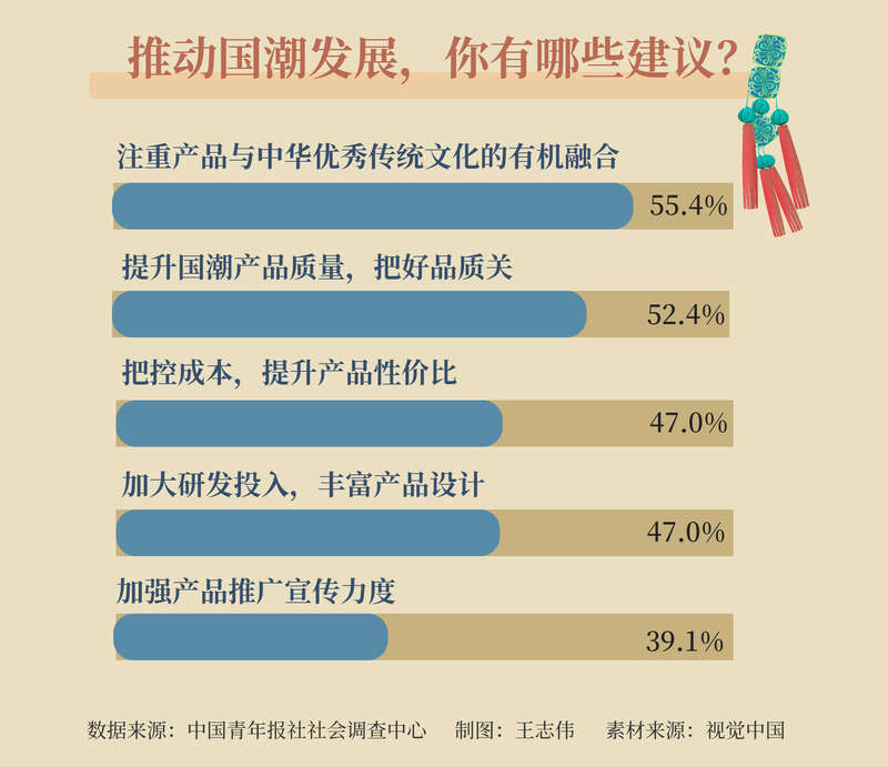 助力国潮发展,55.4%的受访青年建议注重产品与中华优秀传统文化的有机融合,52.4%的受访青年建议提升国潮产品质量,把好品质关。其他还有:把控成本,提升产品性价比(47.0%);加大研发投入,丰富产品设计(47.0%);加强产品推广宣传力度(39.1%)等。