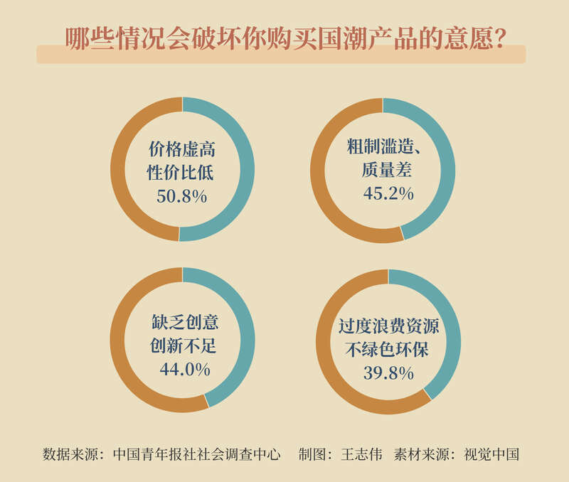 而在万物皆可国潮背景下,什么样的国潮产品让年轻人反感?价格虚高、性价比低(50.8%),粗制滥造、质量差(45.2%),缺乏创意、创新不足(44.0%)排在前列。