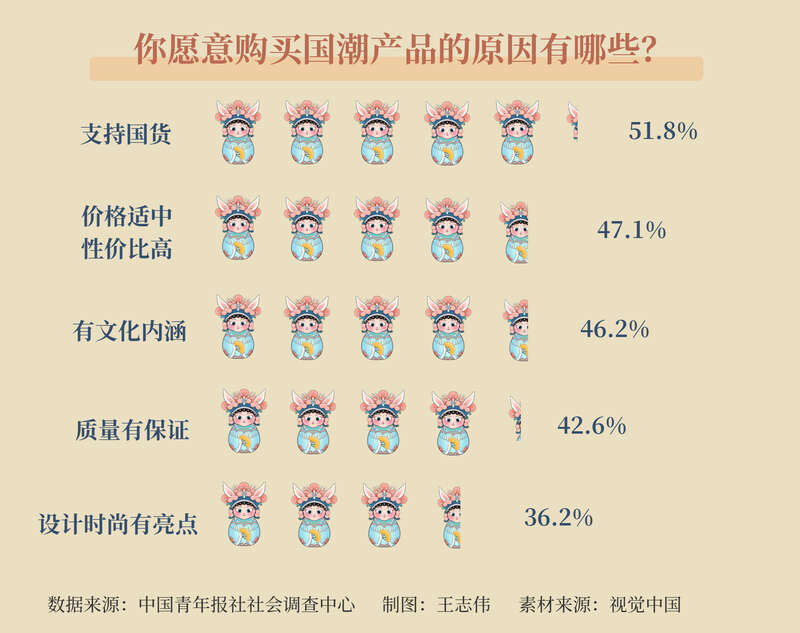 国潮产品为何会吸引年轻人消费?调查显示,支持国货排在首位,获选率为51.8%,之后是价格适中、性价比高(47.1%),46.2%的受访青年看重国潮产品有文化内涵。国潮兴起背后是年轻人对国货更感兴趣了,对本土产品更有信心了。另外,国潮产品的质量、设计、使用体验感、市场口碑等也是年轻人评判值不值得为此“掏钱”的重要因素。