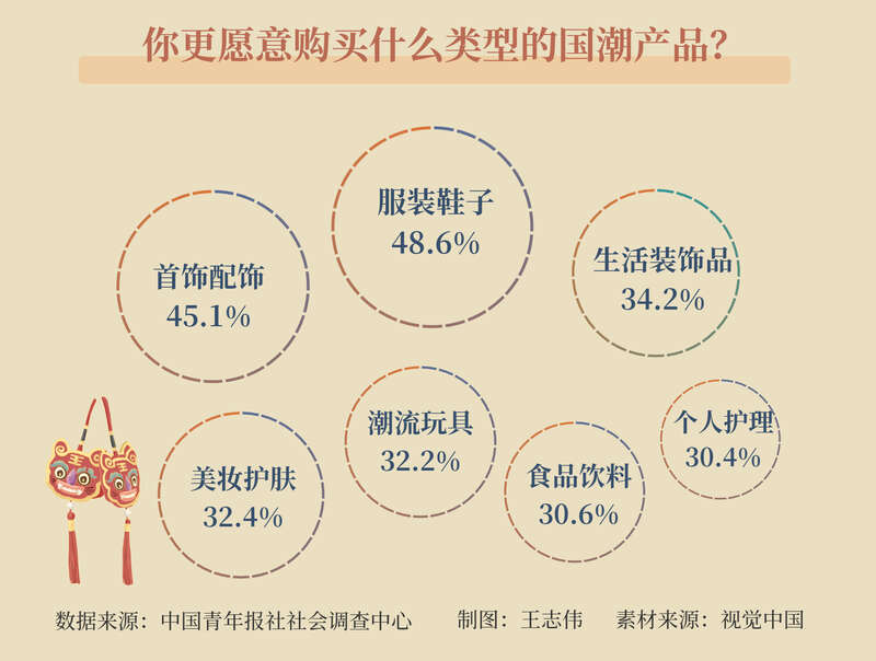 年轻人爱购买什么类型的国潮产品?调查显示,服装鞋子、首饰配饰排在前两位,另外,生活装饰品、美妆护肤、潮流玩具、食品饮料、个人护理等也是受访青年愿意购买的国潮产品。