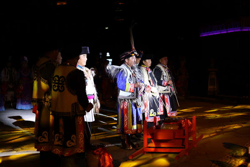 11月1日,四川省阿坝藏族羌族自治州茂县,中国古羌城庆羌年文艺演出现场,演员正在表演传统祈福仪式。吴霞/摄