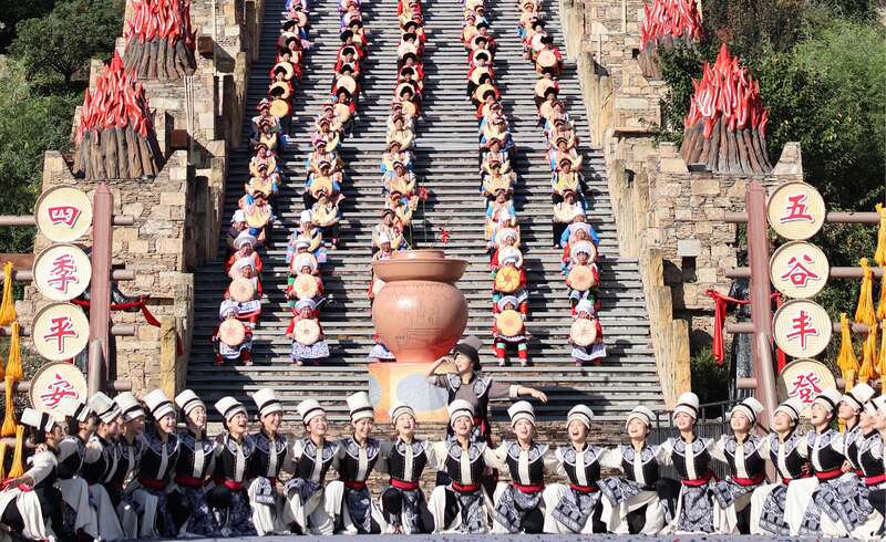 11月1日,四川省阿坝藏族羌族自治州茂县,中国古羌城庆羌年文艺演出现场,阿坝师范学院学子带来表演《尼萨·妈妈的歌谣》。吴霞/摄