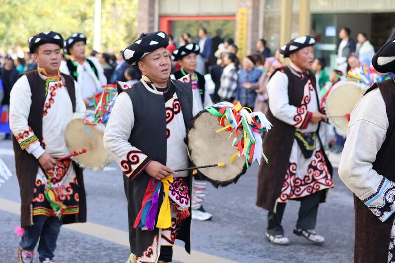 11月1日,四川省阿坝藏族羌族自治州茂县,非遗巡游代表队沿茂县老城区表演羊皮鼓舞。吴霞/摄