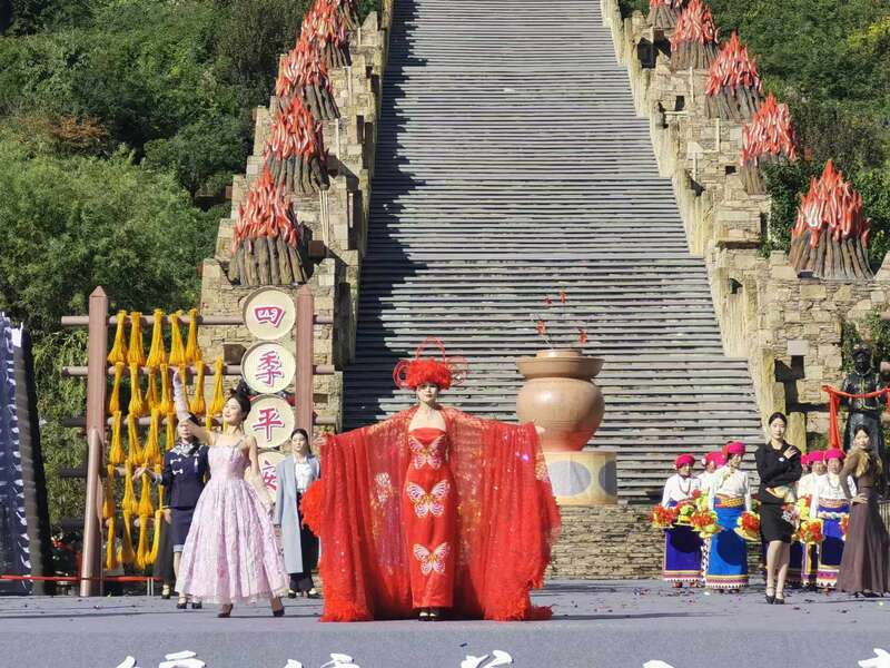 11月1日,四川省阿坝藏族羌族自治州茂县,中国古羌城庆羌年文艺演出现场,来自四川绵阳北川羌族自治县的演员带来《羌族服饰秀》展演。吴霞/摄