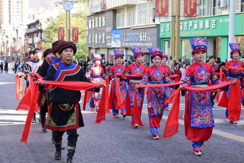 11月1日,四川省阿坝藏族羌族自治州茂县,非遗巡游代表队手捧羌红,沿茂县老城区展演。吴霞/摄