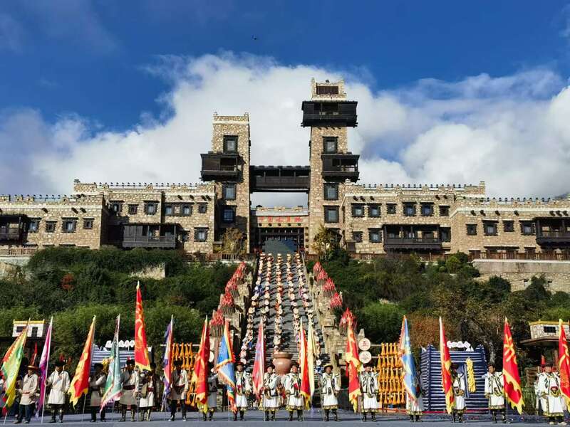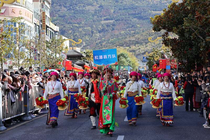 11月1日,四川省阿坝藏族羌族自治州茂县,松潘县代表队沿茂县老城区进行非遗巡游展演。吴霞/摄