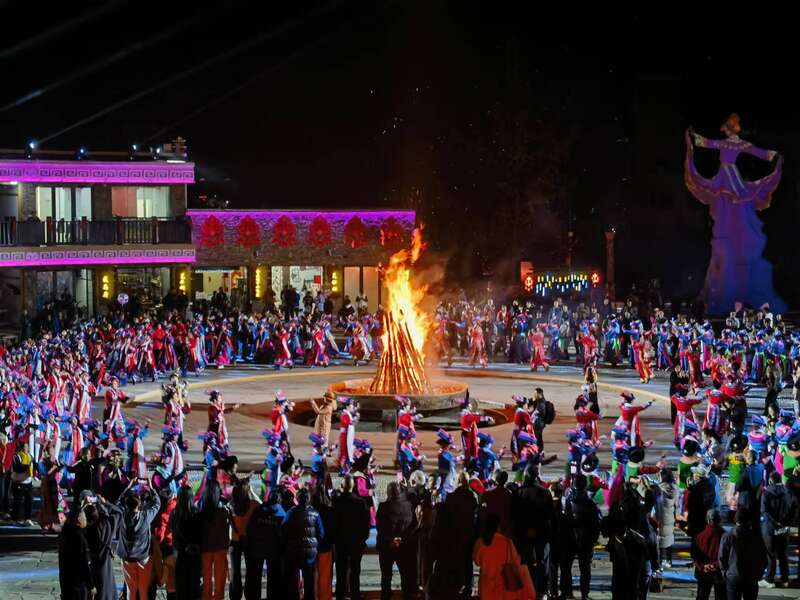 10月30日晚,四川省阿坝藏族羌族自治州茂县,藏羌群众在中国古羌城萨朗广场围着火塘跳锅庄舞。吴霞/摄