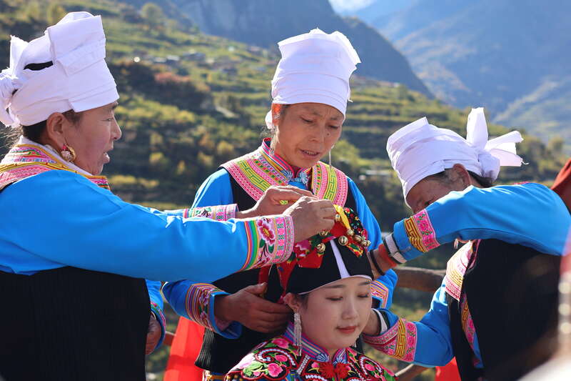 11月1日,四川省阿坝藏族羌族自治州茂县,黑虎羌寨中头戴“万年孝”的妇女在给游客示范绑四方帕。吴霞/摄