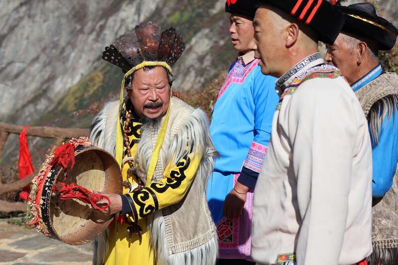 11月1日,四川省阿坝藏族羌族自治州茂县,黑虎羌寨的“释比”传承人余有成(左一)在主持祭祀祈福仪式。吴霞/摄