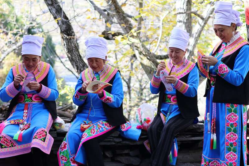 11月1日,四川省阿坝藏族羌族自治州茂县黑虎羌寨,寨中头戴“万年孝”的妇女正在为游客表演刺绣。吴霞/摄