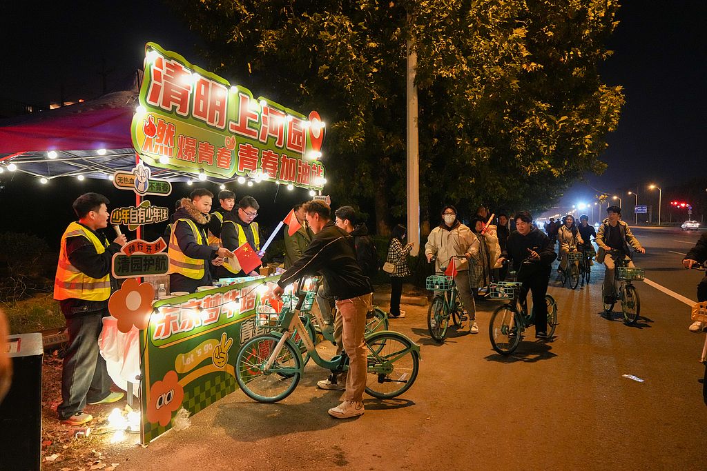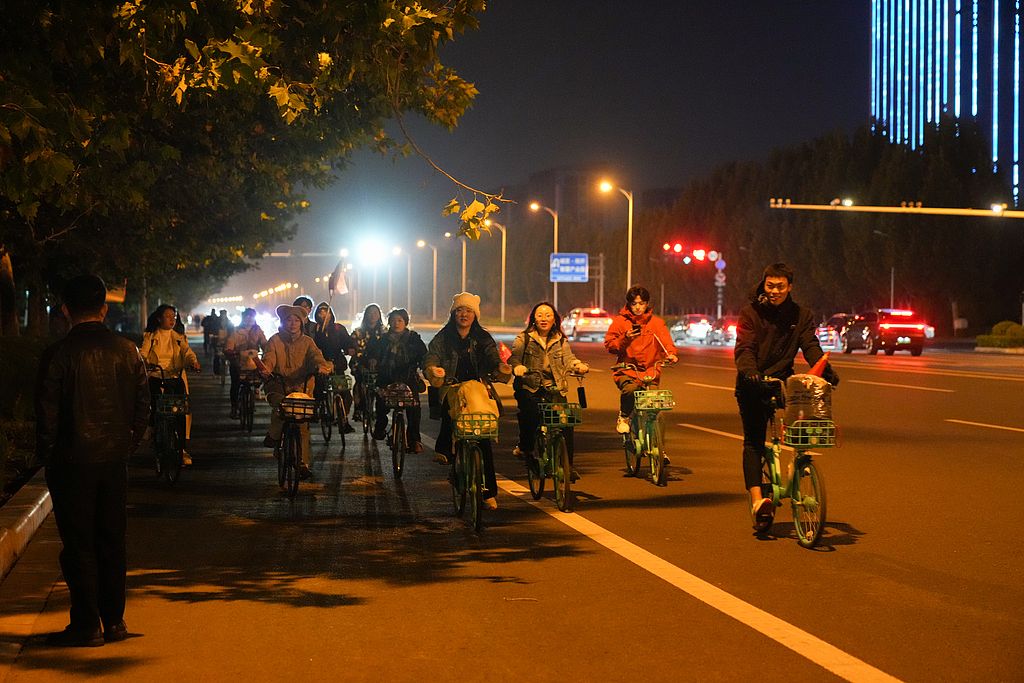2024年11月5日,郑州,大学生成群结队骑共享单车“夜袭”开封。