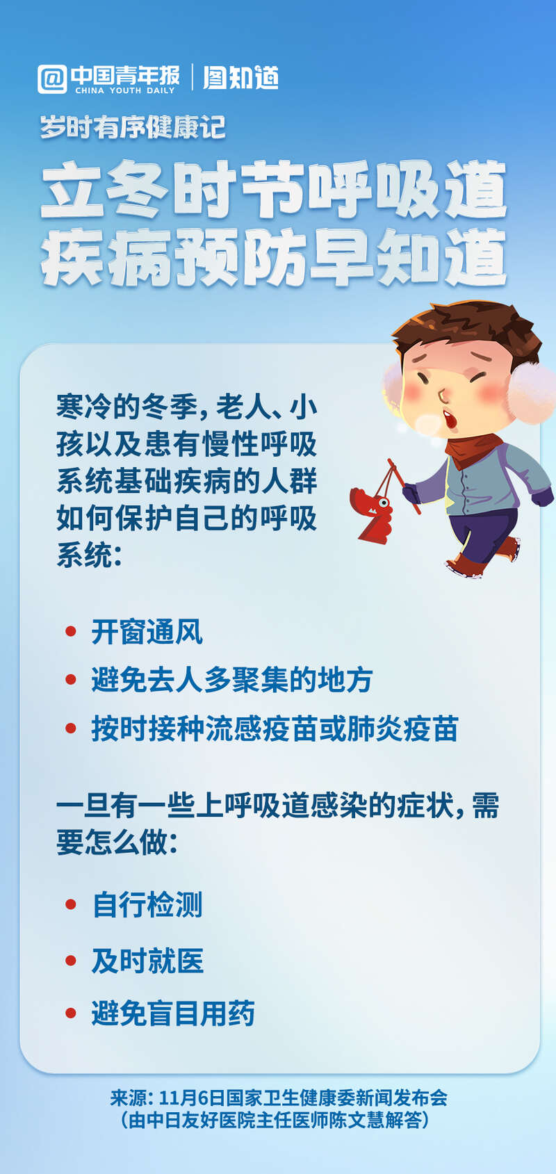 立冬意味着冬季的开始,天气也从秋高气爽向天寒地冻转变。面对天气寒冷、空气干燥的冬季,老人、小孩以及患有慢性呼吸系统基础疾病的人群在呼吸道疾病的预防和护理方面,有哪些需要注意的点?快来读图,看看医生怎么说!