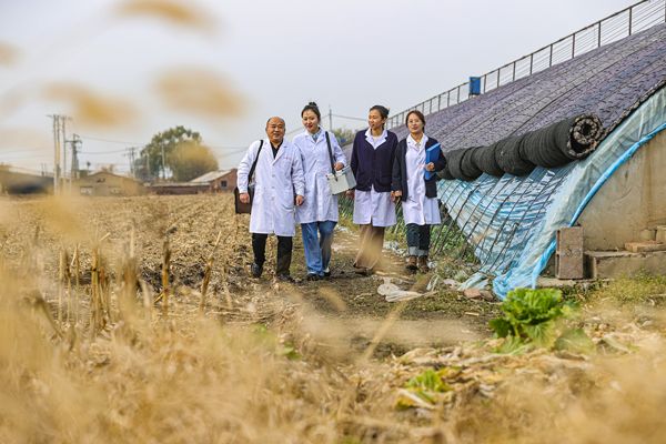 2024年11月11日,辽宁沈阳,大学生村医牟柏余(左二)与同事一起走在入户给居民看病的路上。