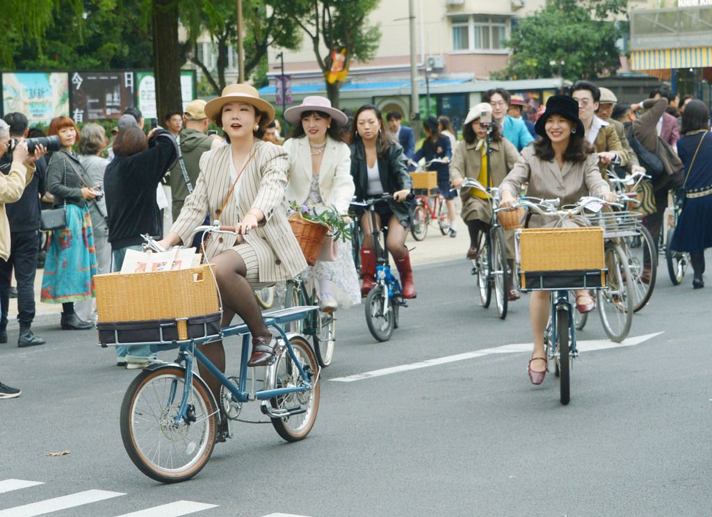 2024年11月16日,上海,一场绅装骑行活动在上生.新所举行,众多青年骑行爱好者穿着经典的绅装,女士则穿着优雅的淑女装,也吸引一些老外骑行者参与其中,大家骑着古董自行车从安西路出发,一路骑行,浏览打卡沿途的老洋房和人文风情,旨在倡导低碳骑行的环保理念。今年的绅装生活节除了在延续经典的绅装骑行活动基础上,融合了集市逛吃、趣味游戏,并设置了年代绅装特展,同时传递东方美学文化。