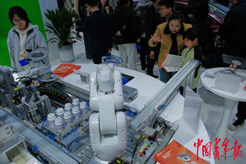 11月20日,浙江省桐乡市乌镇,2024年世界互联网大会“互联网之光”博览会,一条全自动AI具身智能生产线正在运行,吸引参观者驻足观看。中青报·中青网记者 田嘉硕/摄