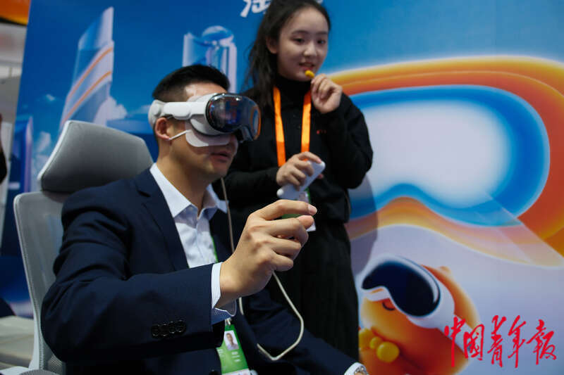 11月20日,浙江省桐乡市乌镇,2024年世界互联网大会“互联网之光”博览会,一名参观者穿戴VR设备沉浸式体验超大型自动化集装箱码头的运行场景。作为2024年世界互联网大会乌镇峰会的重要活动,11月19日至22日,2024年世界互联网大会“互联网之光”博览会在乌镇举行。本届博览会全面展示全球互联网的最新发展成果和人工智能领域的新技术、产品,吸引了来自53个国家和地区的665家中外企业与机构参展。众多参观者穿梭在各个展台,在“视、听、赏、玩”中感受人工智能对各行各业和日常生活的赋能。中青报·中青网记者 田嘉硕/摄