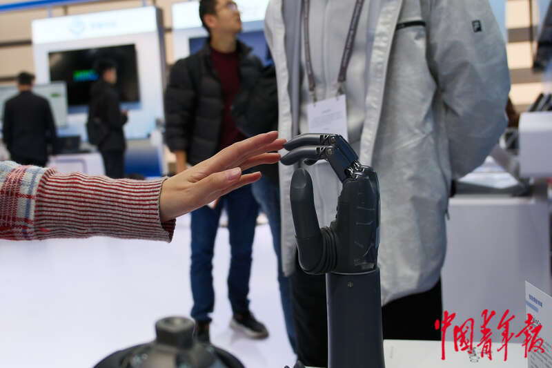 11月20日,浙江省桐乡市乌镇,2024年世界互联网大会“互联网之光”博览会,一名参观者用指尖轻轻触碰一台智能仿生手。中青报·中青网记者 田嘉硕/摄