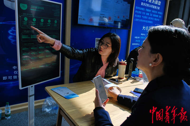 11月20日,浙江省桐乡市乌镇,2024年世界互联网大会“互联网之光”博览会,一名参观者正在体验“AI中医把脉”。中青报·中青网记者 田嘉硕/摄