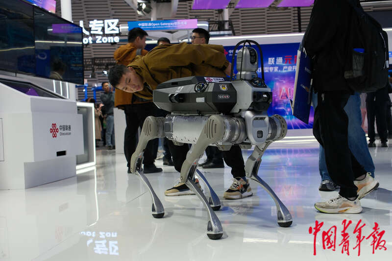 11月20日,浙江省桐乡市乌镇,2024年世界互联网大会“互联网之光”博览会,一名参观者驻足观看一款大型机器狗。据了解,这款机器狗名为侦查巡逻机器狗,是本届互联网大会的智能无人安防装备之一。中青报·中青网记者 田嘉硕/摄