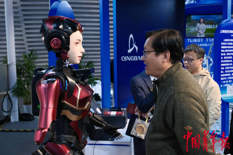 11月20日,浙江省桐乡市乌镇,2024年世界互联网大会“互联网之光”博览会,一名参观者正在与一台人形机器人对话。中青报·中青网记者 田嘉硕/摄