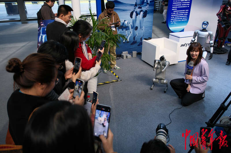 11月20日,浙江省桐乡市乌镇,2024年世界互联网大会“互联网之光”博览会,一款小型机器狗受到参观者围观拍摄。中青报·中青网记者 田嘉硕/摄