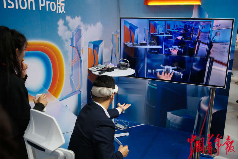 11月20日,浙江省桐乡市乌镇,2024年世界互联网大会“互联网之光”博览会,一名参观者正在体验淘宝“Apple Vision Pro版”。据介绍,用户戴上Apple Vision Pro后,可以把商品投射到现实环境中作比较,实现“身临其境”的网购体验。中青报·中青网记者 田嘉硕/摄