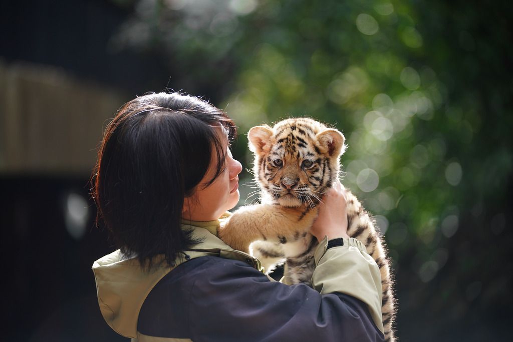 2024年11月21日,云南昆明,饲养员和小老虎在互动。近日,位于昆明市的云南野生动物园11只东北虎幼虎集中亮相,正式与游客见面。这批小老虎为1月至3月龄,目前身体健康,状态正常。 中新社记者 刘冉阳 摄