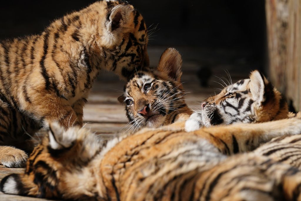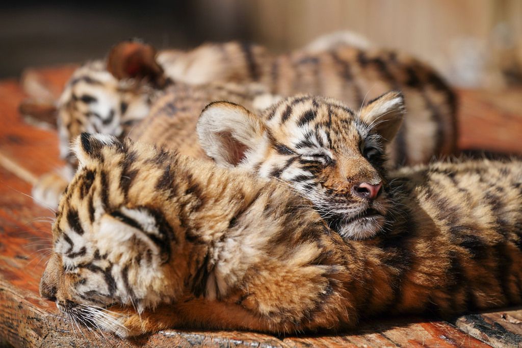 2024年11月21日,云南昆明,小老虎在户外享受“日光浴”。近日,位于昆明市的云南野生动物园11只东北虎幼虎集中亮相,正式与游客见面。这批小老虎为1月至3月龄,目前身体健康,状态正常。 中新社记者 刘冉阳 摄