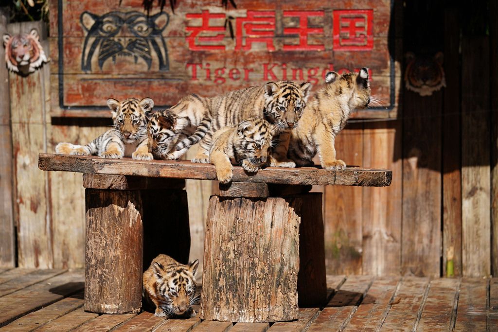2024年11月21日,云南昆明,小老虎在户外玩耍,享受冬日暖阳。近日,位于昆明市的云南野生动物园11只东北虎幼虎集中亮相,正式与游客见面。这批小老虎为1月至3月龄,目前身体健康,状态正常。 中新社记者 刘冉阳 摄