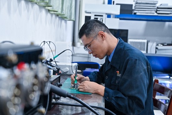 唐文龙说,控制放大器的每块电路板上有130多个焊点,需要使用仪表一个点一个点进行测试。“焊点细小,排列得很紧密,看久了眼睛发酸发胀。”此外,内部两个芯片的管脚数目不一,要仔细核查其功能,一个疏漏,都有可能要推倒重测。