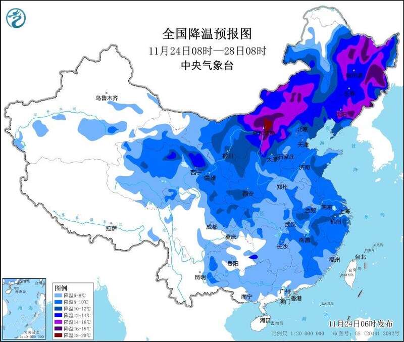 受寒潮影响,预计,11月24日08时至11月28日08时,我国大部地区气温将先后下降6~10℃,其中,西北地区东部、华北北部、内蒙古及东北等地部分地区降温12~14℃,局地16℃以上。