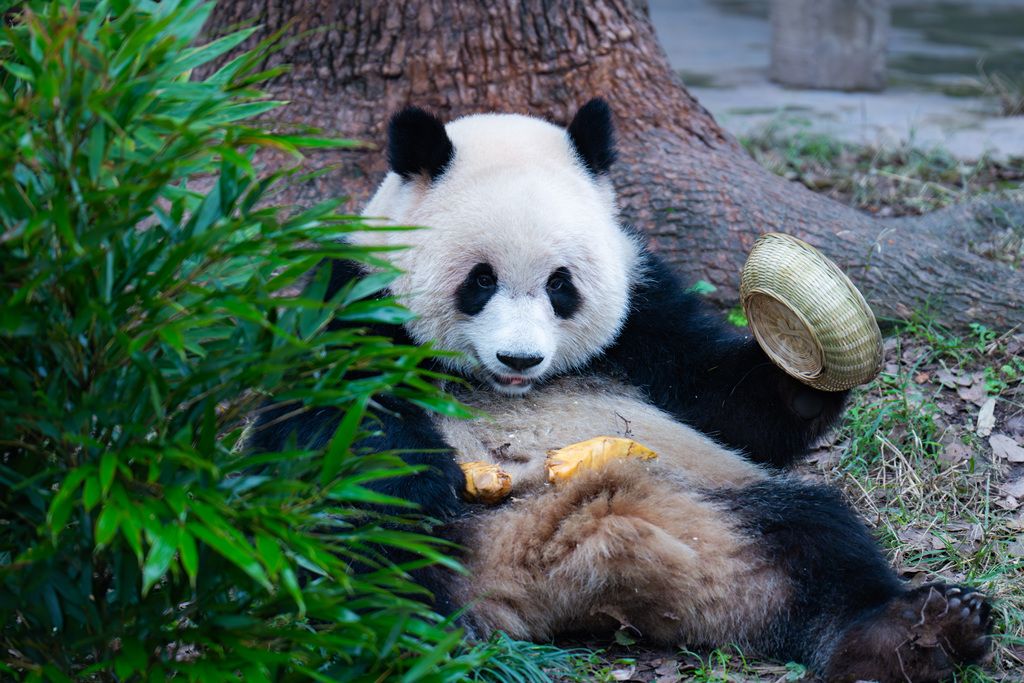 2024年11月23日,重庆动物园,大熊猫“渝爱”在吃竹笋。