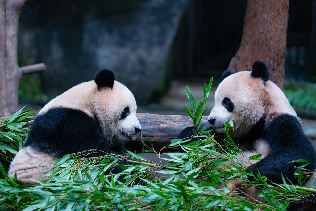 2024年11月23日,重庆动物园,大熊猫“双双”、“重重”在吃竹子。
