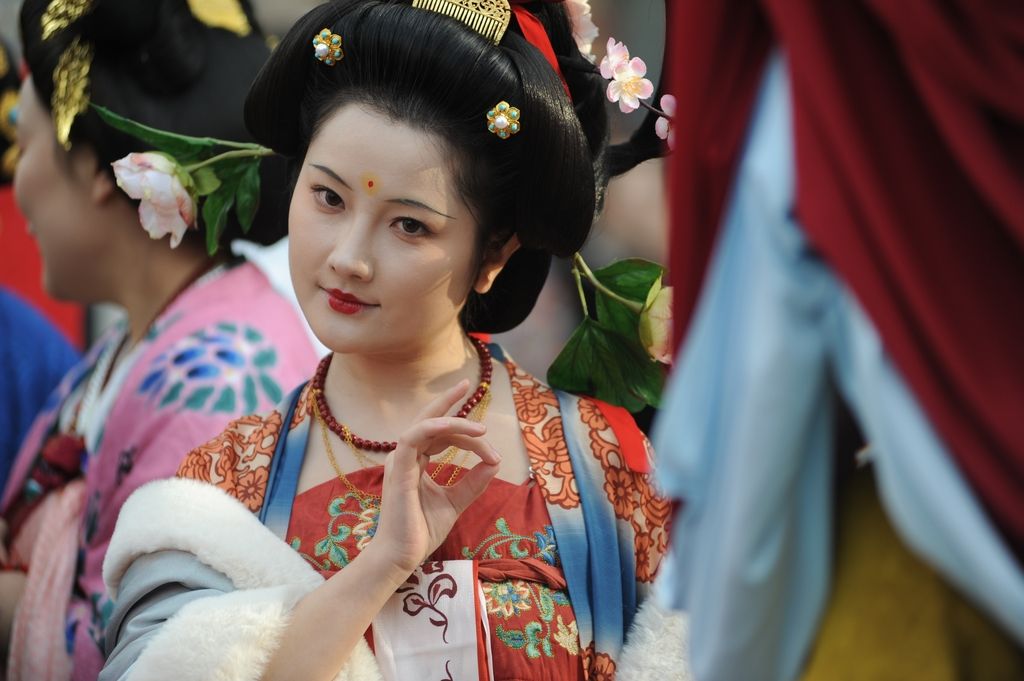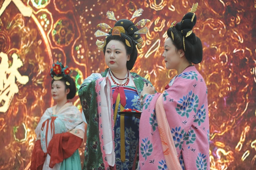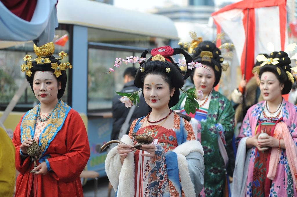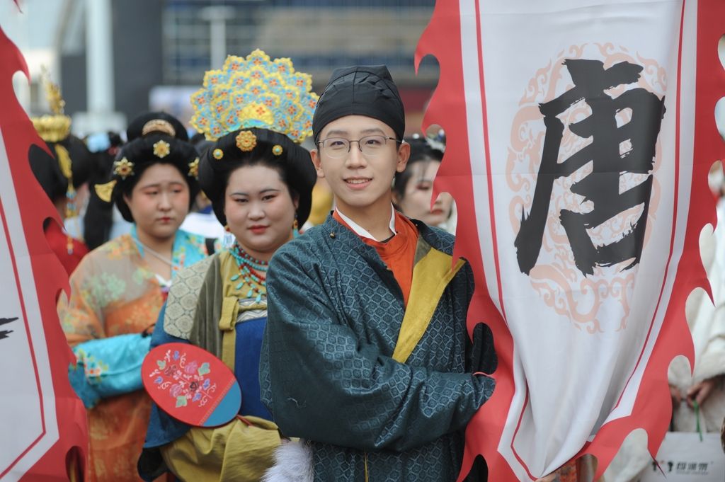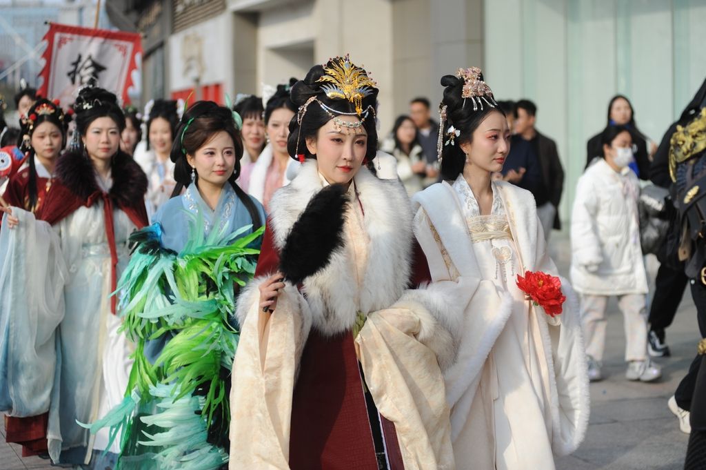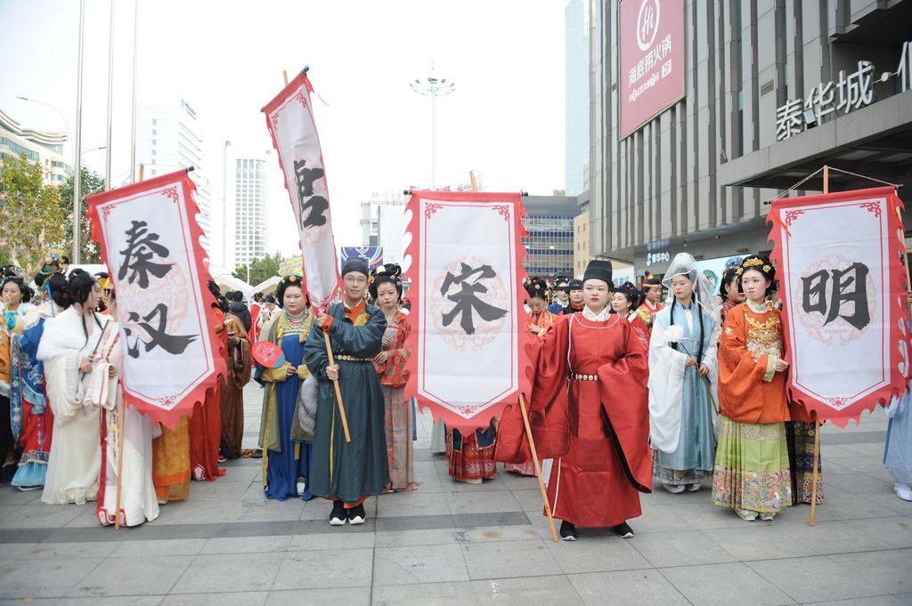 2024年11月24日,山东潍坊汉服文化周,汉服爱好者们通过街头巡游和舞台演绎,展示各式汉服。