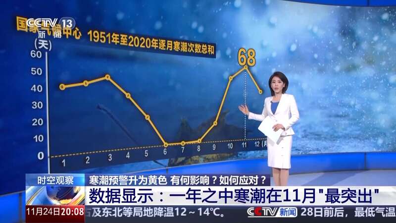 从国家气候中心“1951年至2020年逐月寒潮次数总和”的数据中就可以看到:一年之中,寒潮在11月表现最突出,1951到2020年在我国一共出现了68次,相反在6到7月,则一次都没有露面。