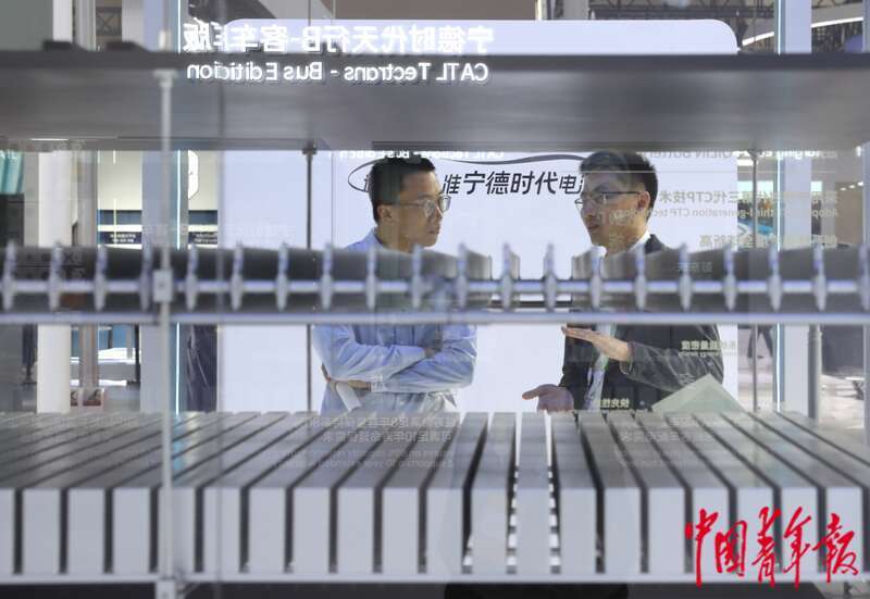 11月27日,北京,中国国际展览中心(顺义馆)第二届链博会智能汽车链展区,宁德时代展位前,两位男士在车用电池块前交流。据介绍,这款新型电池,采用最新的CTP技术,搭载该电池的汽车,充一次电,可以跑1000公里。中青报·中青网记者 陈剑/摄