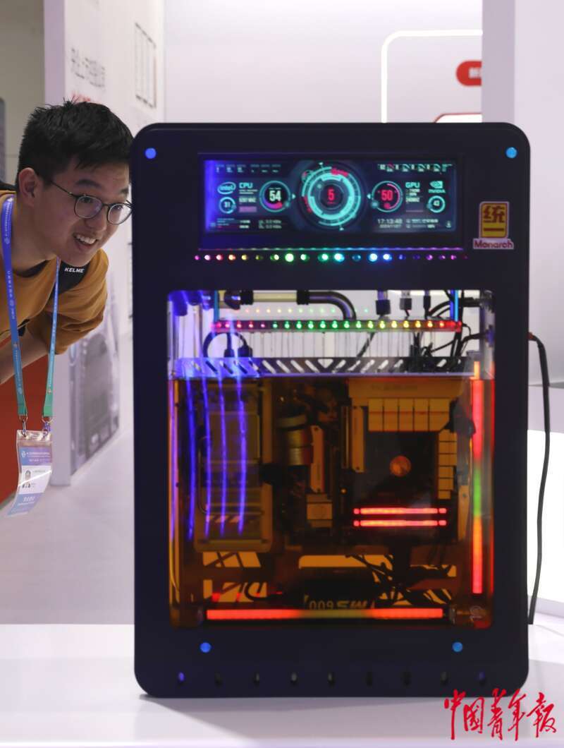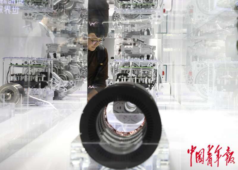 11月27日,北京,中国国际展览中心(顺义馆)第二届链博会智能汽车链展区,某润滑油展位前,参观者在观看一款新型的油冷系统模型。中青报·中青网记者 陈剑/摄