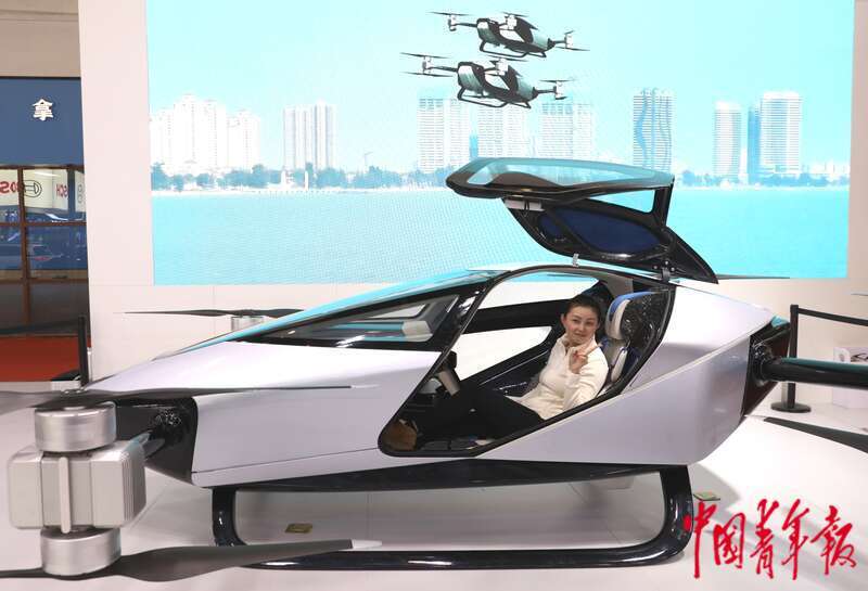 11月27日,北京,中国国际展览中心(顺义馆)第二届链博会智能汽车链展区,小鹏汽车展位前,工作人员正在一款新型的飞行汽车里做展示和介绍。据介绍,该飞行汽车,计划2026年进行量产交付。中青报·中青网记者 陈剑/摄