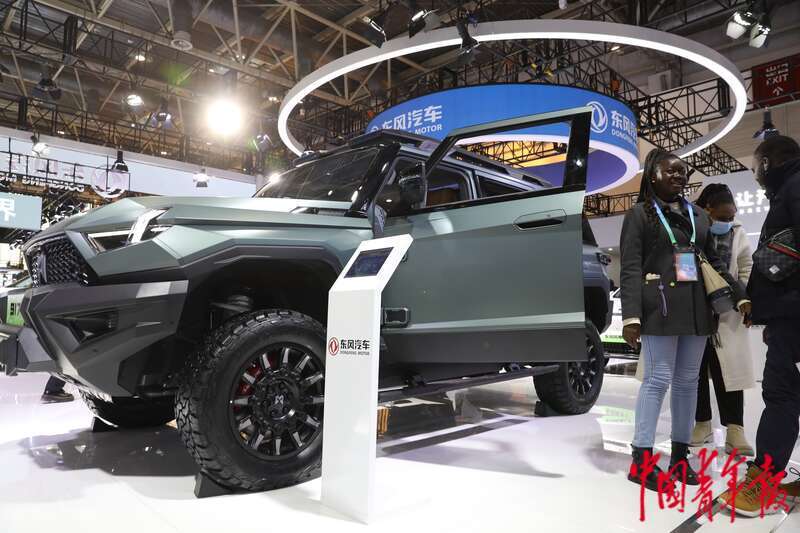 11月27日,北京,中国国际展览中心(顺义馆)第二届链博会智能汽车链展区,来自布基纳法索的几位年轻人体验完东风猛士917智能汽车后,交流心得。中青报·中青网记者 陈剑/摄