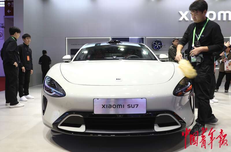 11月27日,北京,中国国际展览中心(顺义馆)第二届链博会智能汽车链展区,小米汽车展位前,工作人员对车身进行清洁保养。中青报·中青网记者 陈剑/摄