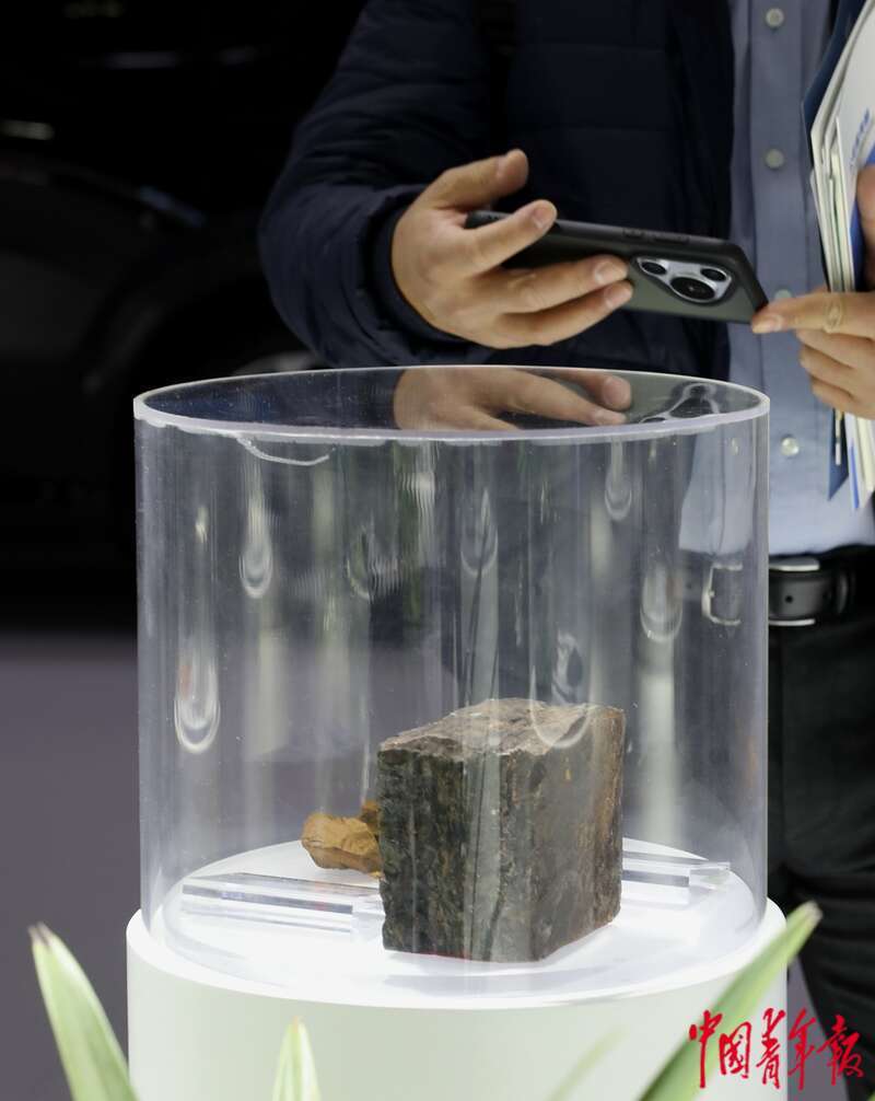 11月27日,北京,中国国际展览中心(顺义馆)第二届链博会智能汽车链展区,力拓展位前,一位参观者在拍摄铁矿石的样本。中青报·中青网记者 陈剑/摄