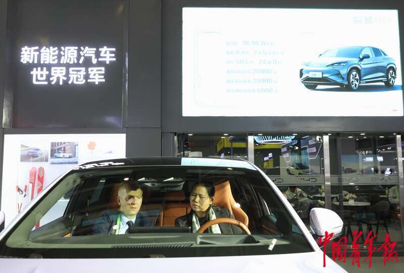 11月27日,北京,中国国际展览中心(顺义馆)第二届链博会智能汽车链展区,两位嘉宾在比亚迪海狮07EV智能汽车的驾驶舱内体验。中青报·中青网记者 陈剑/摄