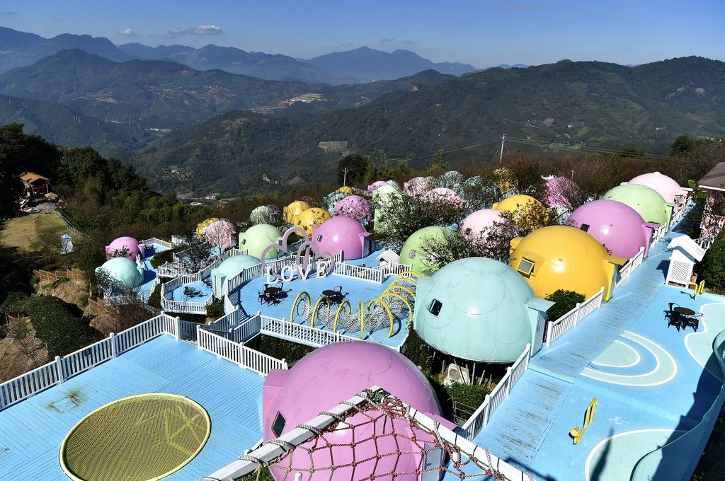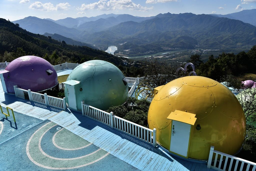 2024年12月3日,在福建省漳州市华安县官畲村内,色彩斑斓的“瓢虫屋”民宿“挂”在高高的山坡上,成为山村一景。 中新社记者 张斌 摄