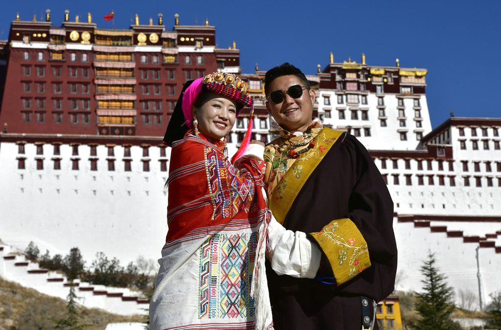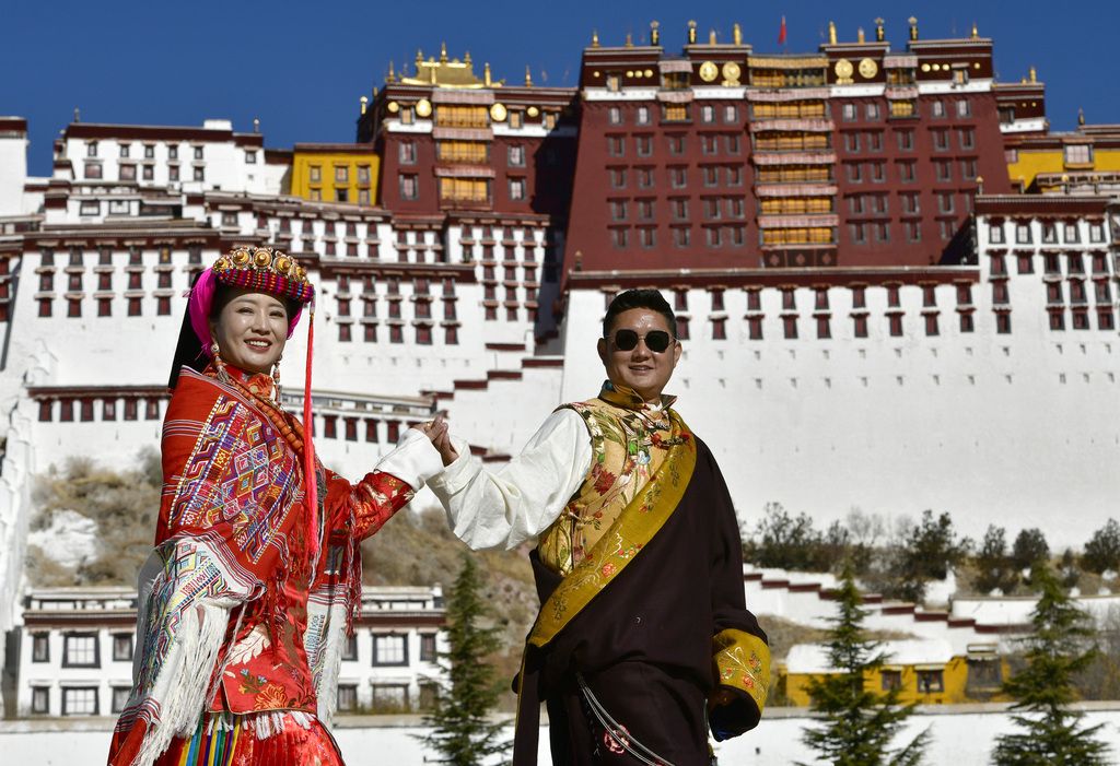 2024年12月3日,西藏拉萨,来自四川的勇忠阿旦(右一)和泽仁夏姆在布达拉宫广场拍照留念。2024冬游西藏活动正在进行,身着藏装在布达拉宫广场拍照留念、在天上西藏主题邮局邮寄明信片成为游客打卡项目之一。 中新社记者 李林 摄