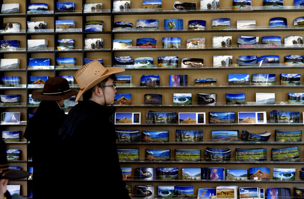 2024年12月3日,西藏拉萨,游客在天上西藏主题邮局挑选明信片。2024冬游西藏活动正在进行,身着藏装在布达拉宫广场拍照留念、在天上西藏主题邮局邮寄明信片成为游客打卡项目之一。 中新社记者 李林 摄