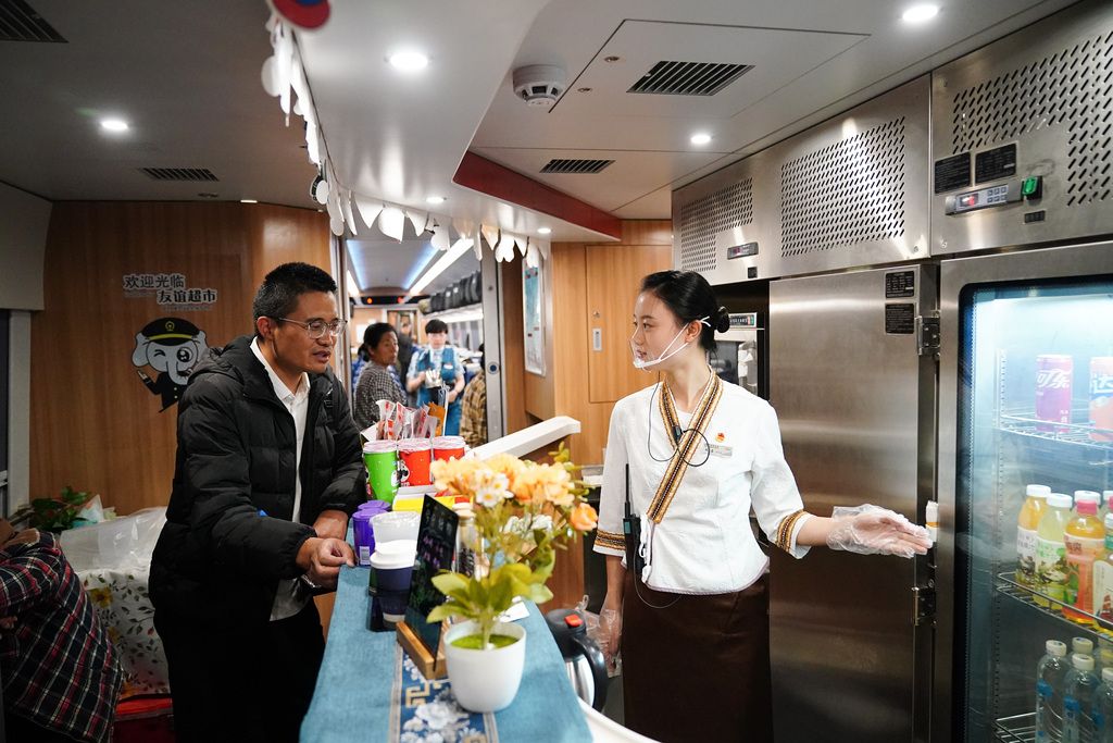 2024年12月3日,中老铁路开通运营三周年。这条铁路北起中国昆明,南至老挝万象,全长1035公里。三年来,中老铁路累计发送旅客超4300万人次、运输货物4830万吨,为促进区域互联互通和沿线经济发展作出重要贡献,已成为中国与南亚东南亚经贸合作的重要桥梁。图为12月2日,云南普洱,旅客在中老铁路旅客列车友谊超市购买商品。 中新社记者 刘冉阳 摄