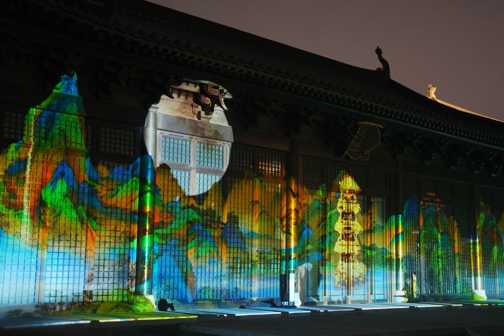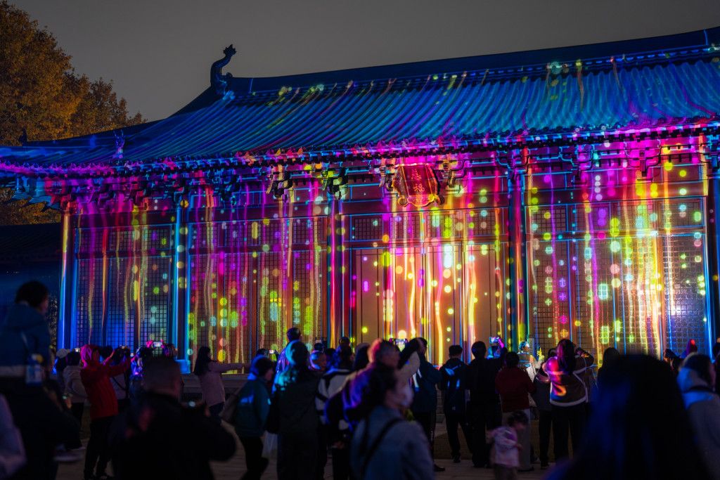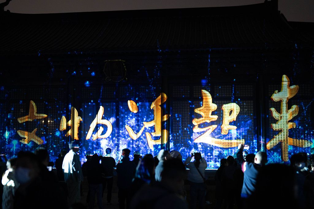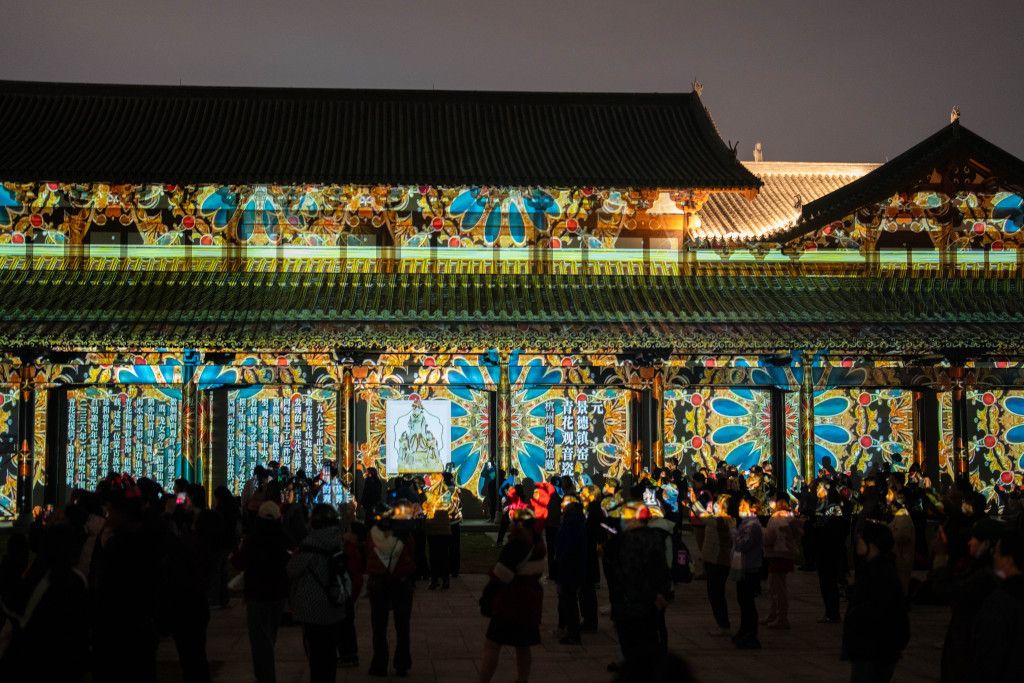 2024年12月4日,杭州,2024年“让文物活起来”第二季光影秀在南宋德寿宫遗址博物馆上演。德寿宫慈福宫广场的宫殿建筑光影交织,宫殿正门、两侧长廊倒映着山河、宫墙、游船、纸扇等动态画面……人群熙熙攘攘,共赏盛宴。