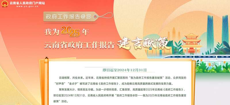 云南省政府也于近日开展“我为2025年云南省政府工作报告建言献策”活动,活动持续至12月31日。据介绍,公众可对促进消费、养老育幼、教育综合改革、政务服务等23个云南省经济社会发展主题建言,建言将提供给政府工作报告起草部门参考。