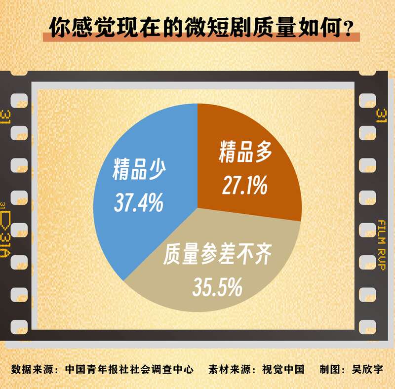 看微短剧的人多了,市场上的内容也就逐渐丰富起来,但微短剧的质量怎么样?2023年12月,中国青年报社社会调查中心的一项针对1129名受访者的调查显示,37.4%的受访者觉得微短剧精品少,35.5%的受访者觉得质量参差不齐,仅27.1%的受访者觉得精品多。制作粗糙经不起推敲(52.4%)、故事和人物设定雷同(50.9%)被认为是存在的主要问题。