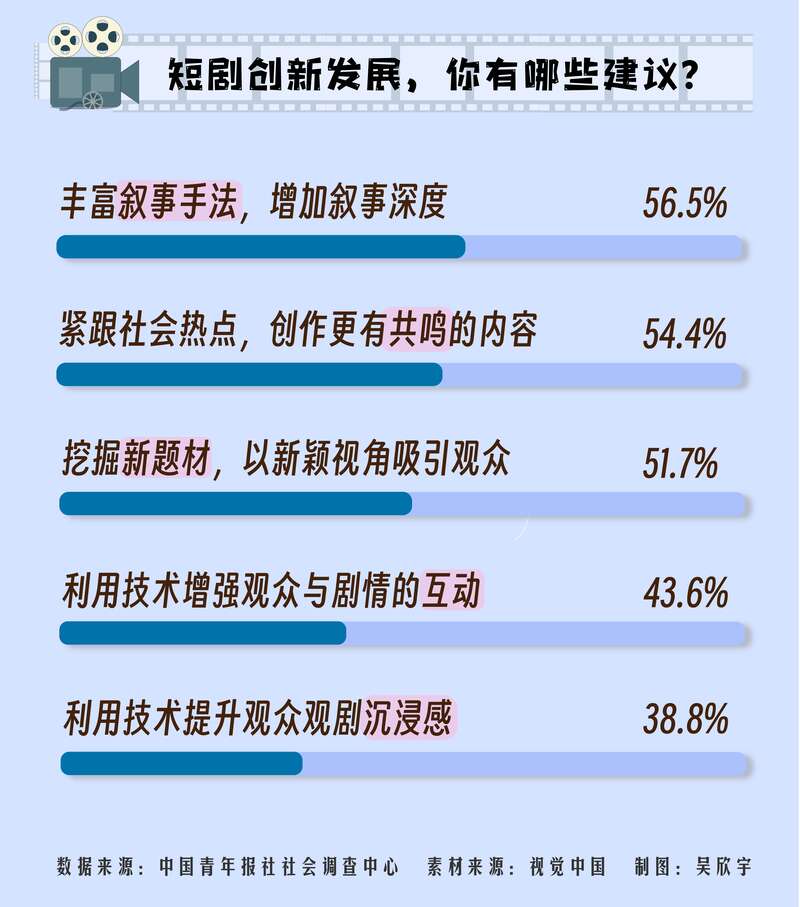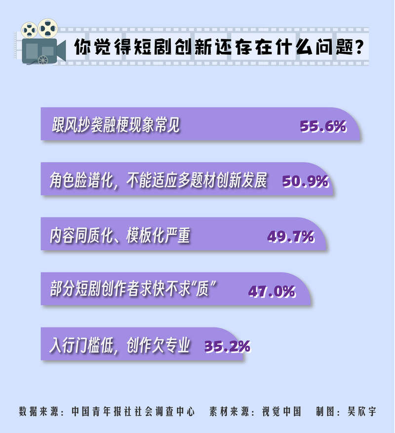 但是,微短剧创新的同时也遇到了一些挑战。一些业内人士表示,微短剧创新往往“第一个吃螃蟹”的人做得比较成功,一旦“出圈”后,同类题材就会被竞相模仿,慢慢地就变味儿了。调查也显示,55.6%的受访者觉得短剧创新发展过程中跟风抄袭融梗现象常见,50.9%的受访青年认为一些短剧角色脸谱化,不能适应多题材创新发展,49.7%的受访者表示一些短剧剧本内容同质化、模板化严重。值得注意的是,像设定雷同问题,在一年前的民调中,就被较多受访者提及。由此可以看到,在微短剧发展过程中,“新意”与精品化制作的重要性。